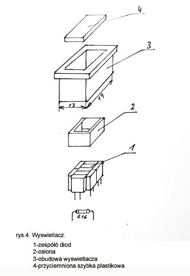Konstrukcja w modelowym wykonaniu jest pokazana na rys.4. Jako obudowa wyświetlacza został wykorzystany korpus wyłącznika typu „Cocker” montowany w standardowym prostokątnym otworze o wymiarach 13x19mm i symbolu katalogowym AE-T8550VBAAA. Należy zwrócić uwagę, aby klawisz i boki otworu wewnętrznego były prostokątne, gdyż są odmiany podobnych wyłączników owalizowanymi bokami i w takim korpusie zespół diod nie mieści się. Z wyłącznika należy usunąć klawisz i obciąć dno ze stykami. W ten sposób uzyskuje się wygodną do montażu obudowę 3. W otwór obudowy należy wkleić klejem „Kropelka” ciemną plastikową szybkę 4. Diody należy skleić ze sobą w sposób pokazany na rysunku (podzespół 1) stosując przekładki z czarnego papieru pomiędzy diodami. Nie należy stosować przekładek pomiędzy wąskimi bokami diod 6, 7, 8, 9, 10. Następnie na zespół diod należy nałożyć osłonę 2, ustalającą grubość ścianek świecącego zbiornika na około 0,4- 0,5mm. Całość wraz z rezystorem R16 i ewentualnie fotorezystorem R15, umieścić w obudowie 3 i zamocować Poxilina lub klejem silikonowym.