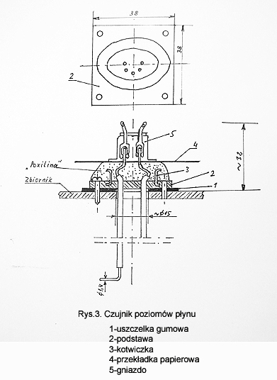 Zbiorniki płynu w celu maksymalnego wykorzystania miejsca pod maską samochodu mogą mieć nieregularny kształt, i w takich zbiornikach objętość płynu nie jest proporcjonalna do wysokości. W takim przypadku długość prętów pomiarowych należy wyznaczyć nalewając do zbiornika odmierzone ilości wody. Pręt nr5 (masa) powinien sięgać na głębokość 3 do 4mm od dna zbiornika. Należy pamiętać o pozostawieniu zapasu na zagięcie końców. Przed rozpoczęciem budowy czujnika trzeba też sprawdzić jak jest iloś…ć wolnej przestrzeni nad planowanym miejscem zamontowania czujnika, gdyż może się okazać, że trzeba będzie zastosować płaskie gniazdo i zagiąć styki do poziomu. Pręty pomiarowe nie muszą być ustawione pionowo, ważna jest wysokość na jakiej znajdują się jej końce. W górnej ściance zbiornika jest wycięty otwór o średnicy ok. 15mm, i czujnik jest przykręcony do ścianki za pośrednictwem gumowej uszczelki czterema mosiężnymi wkrętami do drzewa.