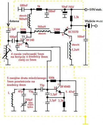 Rezystor 330R w szereg z dławikiem Dł.2 oraz dławik Dł.3 na T2 poprawiły odbiór słabszych stacji.Ponadto zwiekszyłem wartość rezystora R1 na T1.
