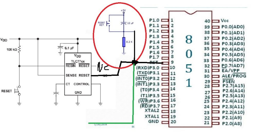 Na wejściu układu, który dorysowałeś jest przycisk reset i nie trzeba dodawać tego w kółku. Ten oznaczony kółkiem nie będzie działał, ponieważ w stanie spoczynkowym na wyjściu TL7705 jest poziom niski (masa). Jeśli dodasz przycisk, który spowoduje dołączenie do tego wyjścia "plusa", to po prostu zrobisz zwarcie. A więc: - wykorzystaj przycisk z aplikacji układu, opisany jako reset, -jeśli potrzebujesz zewnętrzny reset (ten oznaczony zieloną linią), to dołącz go wejścia TL7705, za przyciskiem z aplikacji. Mikrokontroler będzie zerowany poziomem niskim (zwarciem wejścia TL7705 do masy).