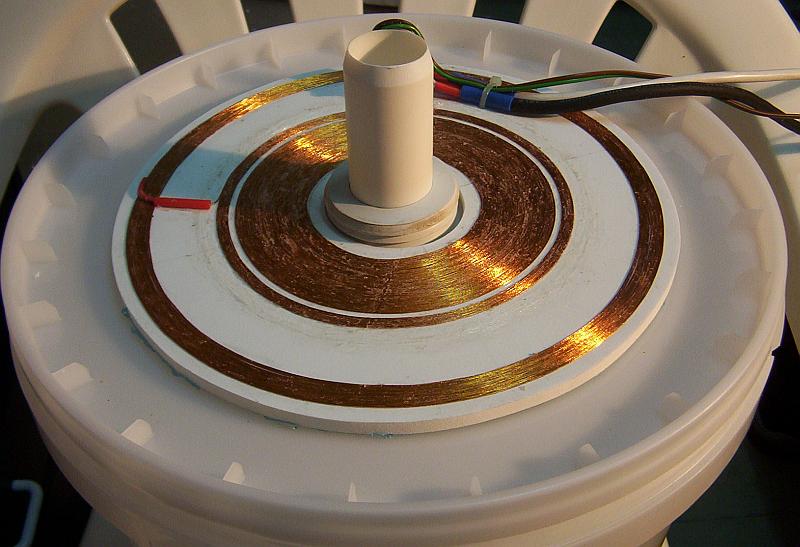 Przez całą głębokość wiadra prowadzi zaślepiona rura, która posłuży do "zanurzania" próbek w gruncie. Konieczne było wycięcie otworu w środku sondy, co z kolei wymusiło ponowne równoważenie sondy, już bez drutu biegnącego przez środek. Pożądany skutek dało odwinięcie ¾ zwoju cewki TX i ¼ zwoju cewki BUCK, co widać na zdjęciu. Ciekawe, że te zabiegi zmniejszyły indukcyjność cewki TX w bardzo niewielkim stopniu.