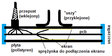 Przykleiłem punktowo kilka cieniutkich drucików z linki miedzianej do laminatu tworząc jakby gwiazdkę. W środku gwiazdki miałem kilka drucików do których przylutowałem przewód. Następnie wszystko zamalowałem grafitem. Jak już pisałem nie wiem na ile była to skuteczna metoda.