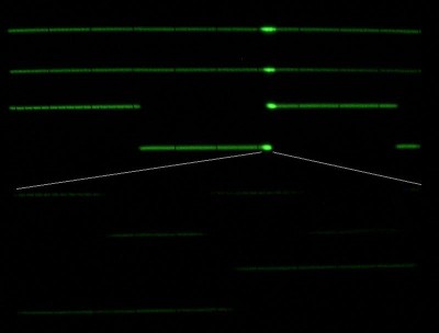 W dolnej połówce ekranu jest rozciągnięty fragment (rozjaśniony) przebiegu z górnej połówki.