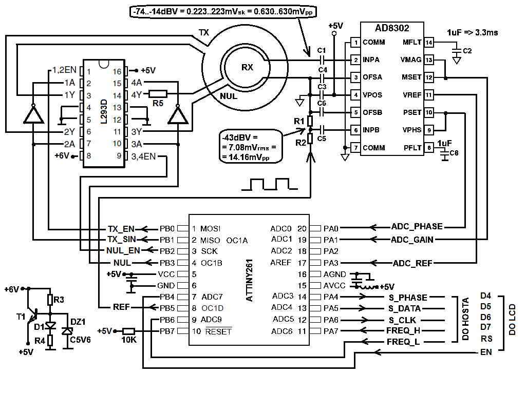Moduł przedstawiony na schemacie ma być w założeniu zamontowany w pobliżu a może nawet bezpośrednio na sondzie. Do układu ma być doprowadzone napięcie 6V (5..7V) i kilkuprzewodowa szyna do komunikacji z pulpitem (klawiatura, głośnik, LCD). Jedynym zadaniem modułu ma być przetwarzanie przesunięcia fazowego między przebiegiem nadawanym cewką TX i odebranym przez RX oraz wzmocnienia RX/TX na postać cyfrową i wysyłanie wyników do pulpitu. Opis układu: