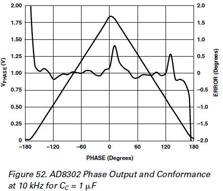 Dlatego proponuję wykorzystanie detektora tylko w okolicy 90°, gdzie błąd jest najmniejszy. Skoro, jak podaje AD wartość tego błędu rośnie z częstotliwością (przy 100MHz - 0.7°, 900MHz - 0.75°, 1900MHz - 0.8°, 2200MHz - 0.85°), to jest szansa, że przy znacznie niższych błąd będzie mniejszy.