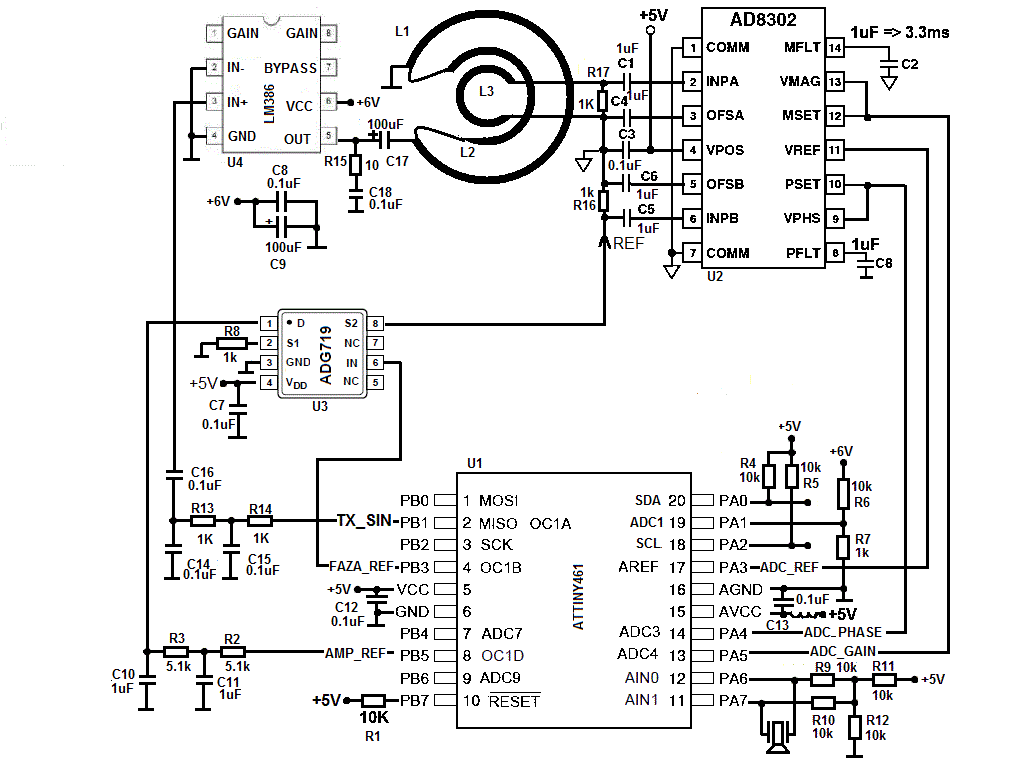 Najlepiej będzie jednak zasilać cewkę TX przebiegiem sinusoidalnym, dlatego L293 wylatuje a jego miejsce zajmie LM386 z filtrem dolnoprzepustowym dla sygnału TX_SIN na wejściu.