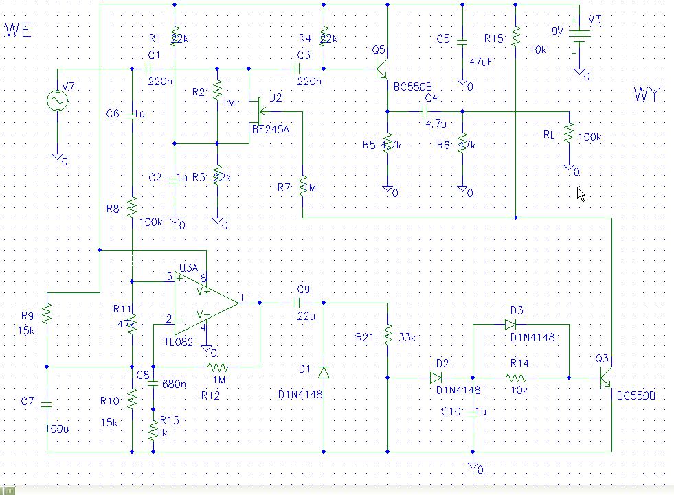 ok, zsrobiłem symulacje w Pspice i układ nie działa, tzn. niezależnie od amplitudy sygnału wejściowego na wyjściu otrzymuje ten sam sygnał o dużo mniejszej amplitudzie, poza tym doszedłem jeszcze do tego ze wzmacniacz operacyjy wogole nie wzmaćnia , na wyjściu jest to samo co na wejściu, co jest przyczyną ?? prosze o pomoć