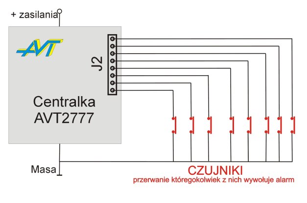 W stanie jalowym na monitorowanej linii musi wystepowac potencjal masy. Zerwanie tego połączenia wywołuje alarm. Takie rozwiązanie umożliwia podłączenie czujek z wyjściem NC - normalnie zwarte - daje to pewność że przy próbie przecięcia kabla zostanie wywołany alarm.