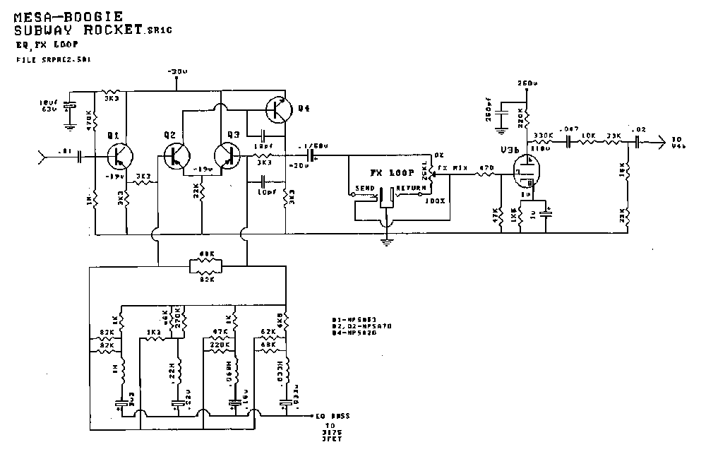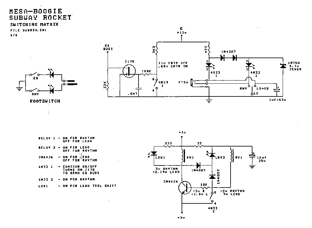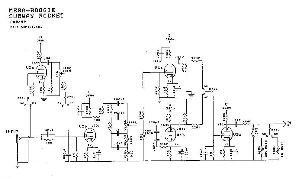 W korektorze zastosowałem potencjometry zamiast stałych rezystorów i zmieniłem układ załączania przekaźników. Zasilane wyższym napięciem przez rezystor i przy cewkach kondensator i dioda.W przyszłości będę stosował transoptory H11f1. Takie stosuje Laney w swoich konstrukcjach. Było tak wiele zmian ,że na pcb zrobił się niezły bałagan. Wzmacniacz zasila cztery głośniki 8 calowe w obudowie z pochloną częściowo płytą przednią. Całść naprawdę ma niezłego kopa. Miałem cały schemat narysować, ale te piski i gwizdy nie dawały mi spokoju. Teraz, kiedy całość zagrała to namaluję cały schemat. Na razie cały schemat mesa-boogie.