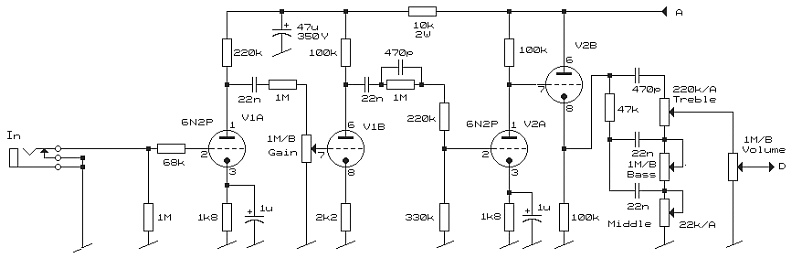 Ten przedwzmacniacz praktycznie wygląda tak samo jak JCM800, tu masz to gotowe na płytce viewtopic.php?t=16518 zobacz może akurat Ci podejdzie, zrezygnowałbyś tylko z diod prostowniczych, choć na upartego mogą zostać! Ale jak chcesz to mogę to zmienić albo zaprojektować Ci to wszystko na jednej wspólnej płytce, uniknąłbyś w tedy problemów z prowadzeniem mas i tym podobne!