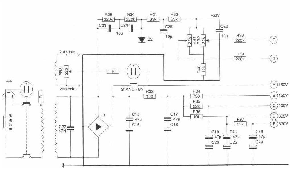 W tym zasilaczu ze wzmacniacza który podałeś (ten z EP) jest poważny błąd.Przełącznik Stand By odłącza tylko napięcie anodowe pozostawiając napięcie na S2.Zgadnij co wtedy z lampami się dzieje?Czerwone siatki S2 i padaka.