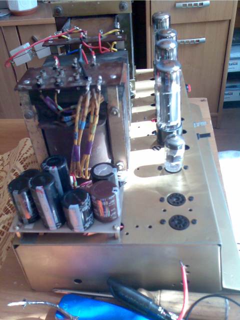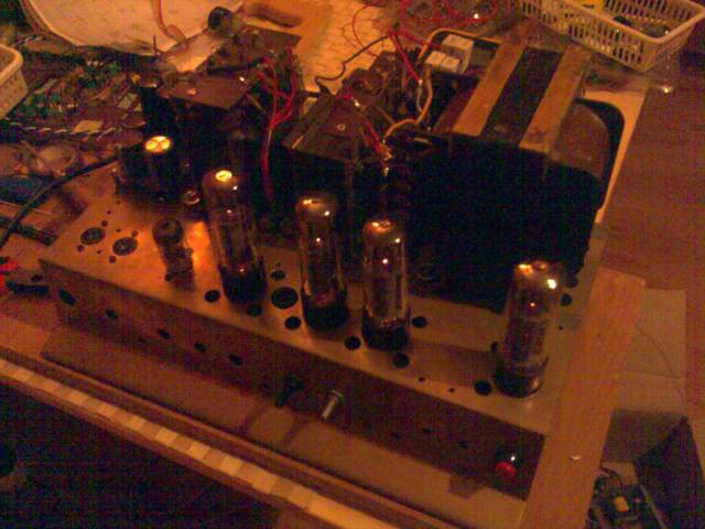 Wzmacniacz przerabiam gruntownie, tzn. wywaliłem całe okablowanie i prostownik, Prostowniki robię na mostkach prostowniczych, żarzenie stopni wstępnych jest za pomocą napięcia stałego i uwaga - przedwzmacniacz jest na dwóch pentodach EF86.