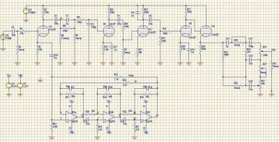 Pozwolę sobie wrzucić schemat Kolegi Pi-Vo który zdecydowanie będzie lepszym rozwiązaniem od tej co zamieściłeś. Tor sygnałowy praktycznie nie wiele się różni od Twojego, za wyjątkiem trzech aktywnych filtrów w katodzie pierwszego stopnia za pomocą których zostaje już na początku ukształtowana charakterystyka częstotliwościowa, co zdecydowanie poprawi brzmienie i odsłuch przesteru. Lepiej od razu zrób tak jak Kolega Pi-Vo.