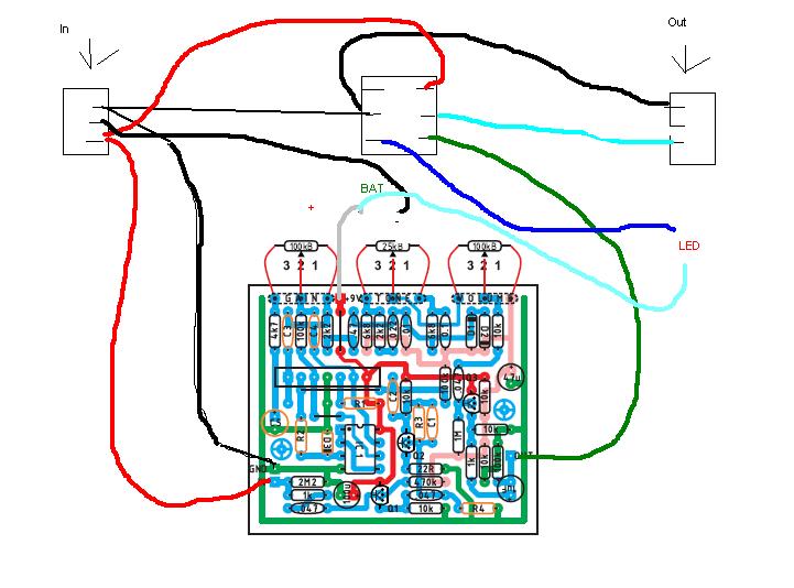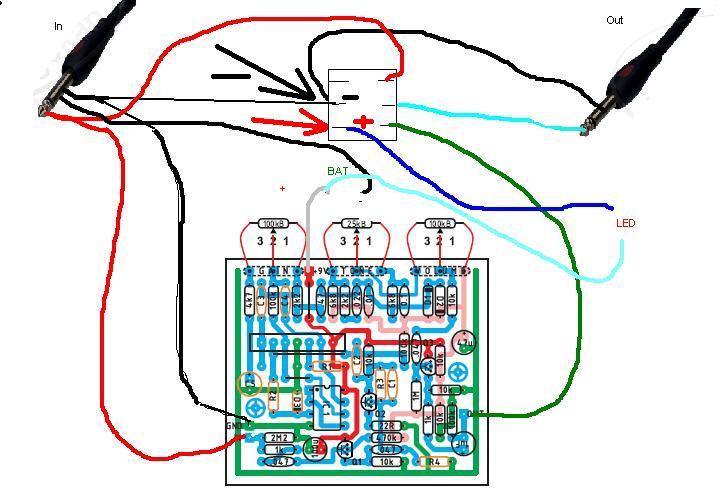 Zasilanie do płytki n(z baterii) będzie dochodzić wtedy, gdy w gniazdo "IN" będzie wpięta wtyczka "JACK _ MONO". To masa wtyczki zwiera zasilanie - a raczej powinienem napisać "robi za włącznik".
