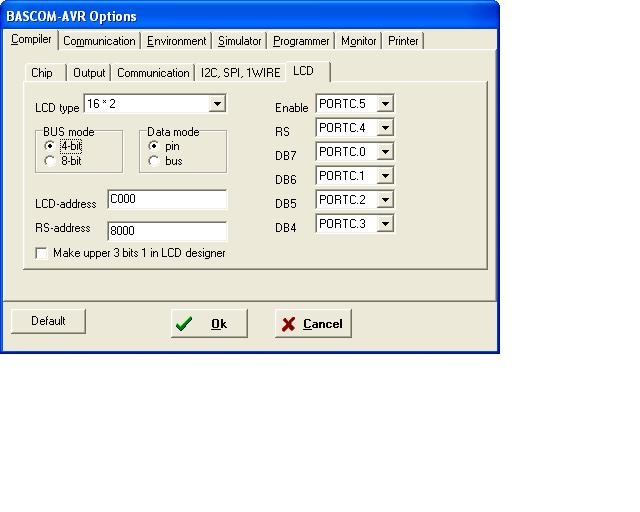 Config Lcdpin = Pin , Db4 = Portc.3 , Db5 = Portc.2 , Db6 = Portc.1 , Db7 = Portc.0 , E = Portc.5 , Rs = Portc.4