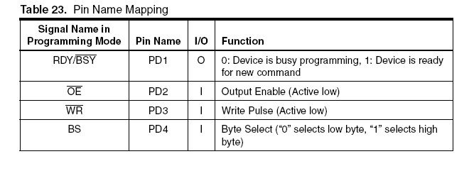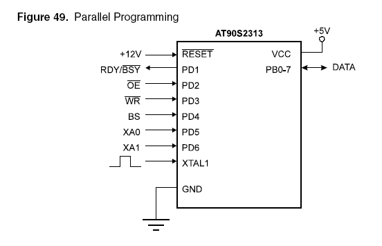 Wszysko się zgadza.Tyle tylko, że przy szeregowym kwarc jest wykorzystywany i fusy można zdjącAkurat przy programowaniu równoległym kwarc nie jest potrzebny (wyprowadzenie XTAL1 słuzy do taktowania poszczególnych bajtów rozkazów). Wynagane jest za to napięcie 12V. Poniżej pare wycinków z dokumentacji pokazujących wykorzystywane piny mikrokontrolera przy programowaniu równoległym. Rodzaj zastosowanego interfejsu również nie określa tego czy mikrokontroler jest programowany równolegle czy szeregowo.