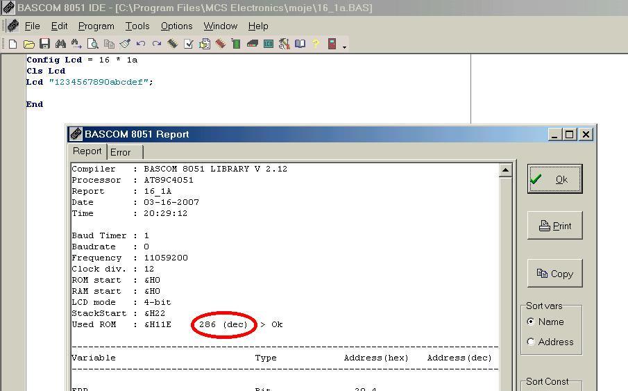 i wtedy porównaj rozmiar generowanego kodu. Bo na podstawie screenów które zamieściłeś takich wniosków wyciągnąć nie można z bardzo prostej przyczyny : w programie korzystasz z procedur obsługi LCD, a one też korzystają z opóźnień, tak więc dodanie instrukcji wait powoduje umieszczenie tylko ich wywołania bo ich kod jest używany przez procedury LCD.