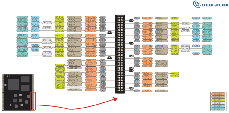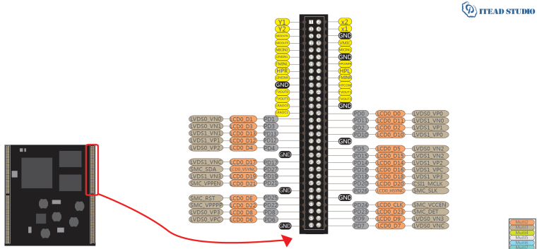 • cztery 36-pinowe złącza zawierające wyprowadzenia interfejsów UART, TWI (I2C), SPI, I2S, PS2, LCD, panelu dotykowego,