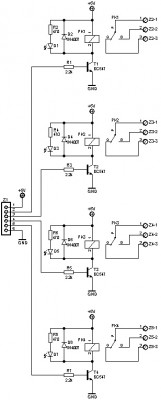 Każdy z bloków składa się z przekaźnika o obciążalności styków 10A przy napięciu maksymalnym 250V oraz tranzystora sterującego jego cewką. Załączenie tranzystora sygnalizowane jest przez diodę LED D1. Cewki przekaźników i diody LED są podłączone do odrębnego zasilacza. Dioda D2 zabezpiecza tranzystor przed uszkodzeniem w wyniku pojawienia się wysokiego napięcia wyindukowanego w cewce przekaźnika przy wyłączeniu. Styki przekaźników doprowadzone są do złącz śrubowych.