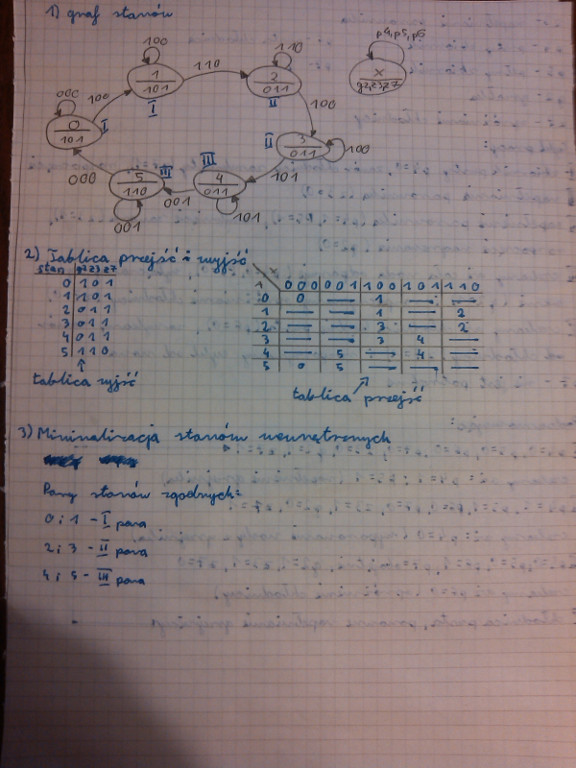 Dziękuje za odpowiedź. Czyli graf jest okej. Widzę że kolega tylko inną kolejność zmiennych zastosował. Pierwotną tablicę przejść-wyjść układu wygląda że też mam dobrze. Grosza sprawa teraz z Minimalizacja dla Mealeygo i Moora oraz kodowaniem bo tego nie ogarniam do końca :P.
