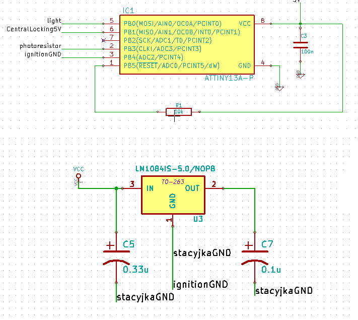 Czemu tak kombinujesz ? Jak zasilasz układ ze stacyjki, to pierwsza zasada nie czyń tego po przez odłączenie masy od stabilizatora, bo usmażysz cały układ. (nie wiem jak jest w przypadku tego LM, ale np. na 78l05 to będzie dym.)Jak zasilam układ z 12V przez stabilizator na 5V. I chcę wziąć sygnał ze stacyjki czy jest ona zapalona czy nie to jakbym po prostu wziął kabelek od masy ze stacyjki w której jest też 12V to nie spali mi portu w attiny? Początkowo chciałem zrobić to przez dzielnik napięcia jednak zasugerował pan, że lepiej byłoby wykorzystać stabilizator napięcia.