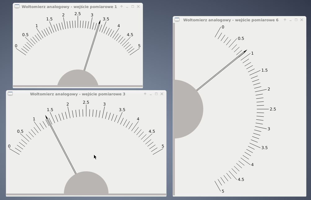 Do obsługi wirtualnego woltomierza napisałem oprogramowanie pozwalające na wizualizację wartości mierzonego napięcia w wybranym kanale. Zakres pokazywany na mierniku ustalany jest automatycznie.