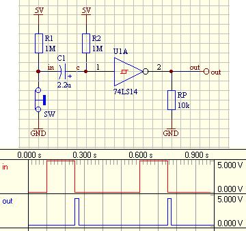 Jeżeli chodzi o fizyczną metodę rozwiązania problemu - wstawiając szeregowo kondensator, w momencie przejścia w stan wysoki otrzymamy impuls. W momencie zejścia na stan niski musimy jakoś rozładować kondensator w taki sposób, aby nie mieć skoku napięcia na wyjściu. Wejście mamy rozwarte, więc nie tędy. Jak rozładować ten kondensator?