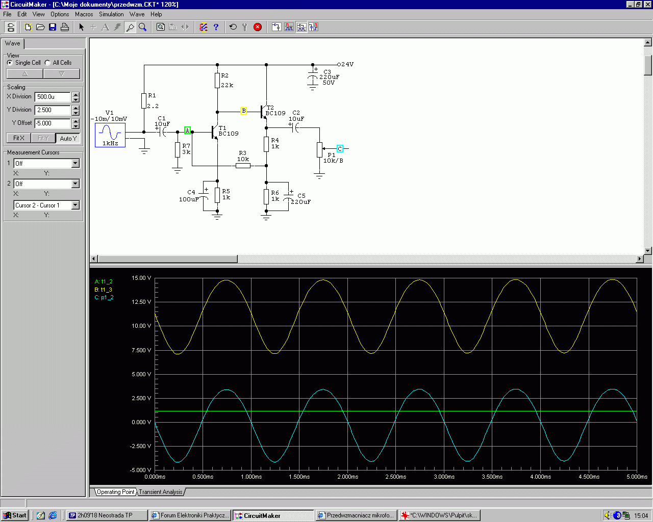 Rozrysowałem narazie schemat i pojawił się problem przy symulacji (rys. 1). Nie wiem, jak by to było w praktyce, ale na wyjściu sygnał jest obcięty na poziomie ok. -1.5V. Gdy dodałem rezystor 3k (1, 2.2, 2.7 też działają poprawnie) zaraz po kondensatorze odzielającym stałą, to wszystko wygląda OK. Poza tym nie znam się na mikrofonach i nie wiem, jak tam jest z wyjściami, czy zawsze są dwa, czy czasem trzy... ? Czy ten 1k/2k2 (nie wymagany przy mikrofonie dybamicznym) powinien być połączony do sygnału, czy do owego trzeciego wyprowadzenia mikrofonu?