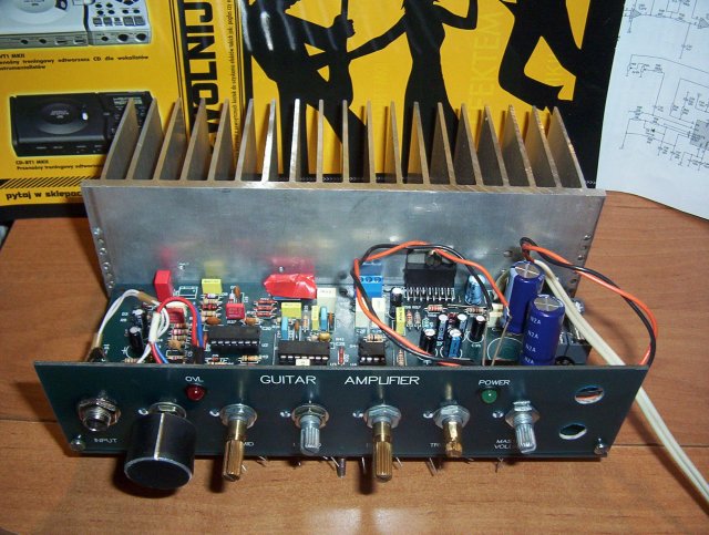 Mi także udało się uruchomić ten wzmacniacz. Brzmi całkiem dobrze (chociaż gitarę mam nędzną). Radiator (z rozbiórki wzmacniacza AX380 Yamaha), do którego jest przykręcona końcówka mocy TDA7294, ma wymiary 6 x 5,75 x 19,3 cm. Trafko zasilające to TS90/16 kupione od Enda. Na prośbę kolegi petersz zamieściłem fotkę kitu (wygląd podczas uruchamiania). Te wystające kondensatory są wlutowane tymczasowo : ) Pozostało jeszcze tylko zrobienie jakiejś obudowy, ale to swoją drogą.
