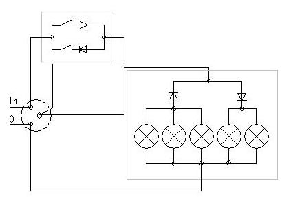 Z faktu, że na Twoim schemacie do żyrandola idą 2 przewody wynika, że wyłączniki muszą być w stanie spoczynku zwarte i raczej monostabilne. Naciskając (rozwierając) na chwilę jeden, możemy wydać jedną "komendę" np. "zapal jedną żarówkę więcej", naciskając drugi - drugą "komendę" - np. "zgaś jedną z żarówek". Równoczesne naciśnięcie obu wyłączy wszystkie żarówki. Odbiornik takiej sygnalizacji (np. 2 transoptory) i sterownik żarówek (2-kierunkowy rejestr przesuwny) jest do zrobienia "na piechotę".W trakcie remontu ktoś zapomniał wymienić przwewód zasilający żyrandol i są tylko 2 przewody jak do jednej żarówki![]()