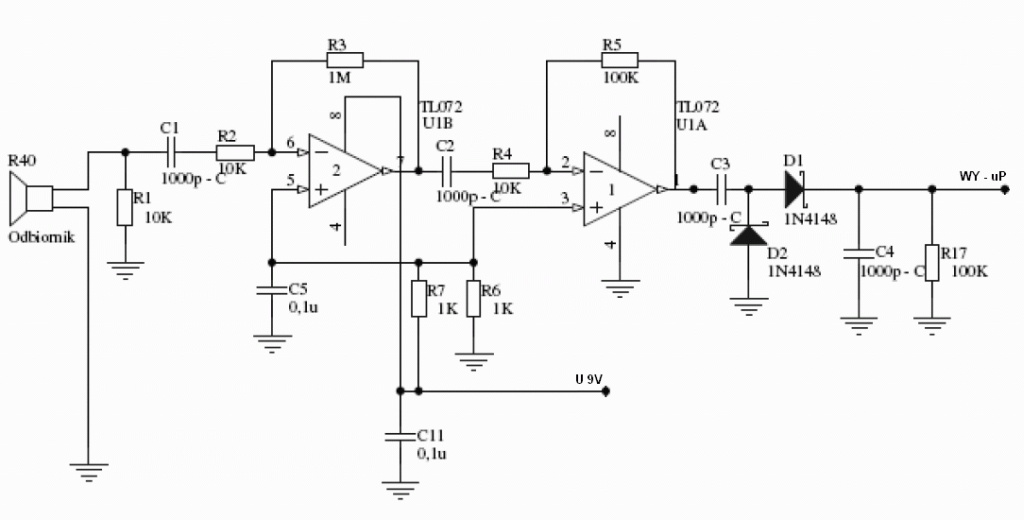 Posiadam dwa przetworniki ultradźwiękowe. Jeden pracuje w układzie nadajnika a drugi w układzie odbiornika. Stosuje układ wzmacniacza sygnału jak na rysunku. Wcześniej zrobiłem podobą wersję, bardziej uproszczoną na wzmacniaczu nieodwracającym - niestety nie działał. Nie bardzo rozumiem idei działania tego zmacniacza. Czy mógłby ktoś mniej więcej wytłumaczyć jak on działa? Model odrwacający odrwaca sygnał wejściowy w fazie tak? czyli powiedzmy na wejściu mam dodatnią połówkę sygnału to na wyjściu IC2 jest "-" w stosunku do masy? Następnie ten sygnał dociera do IC3 gdzie znowu jest odrwacany i na wyjściu otrzymuje "+"?