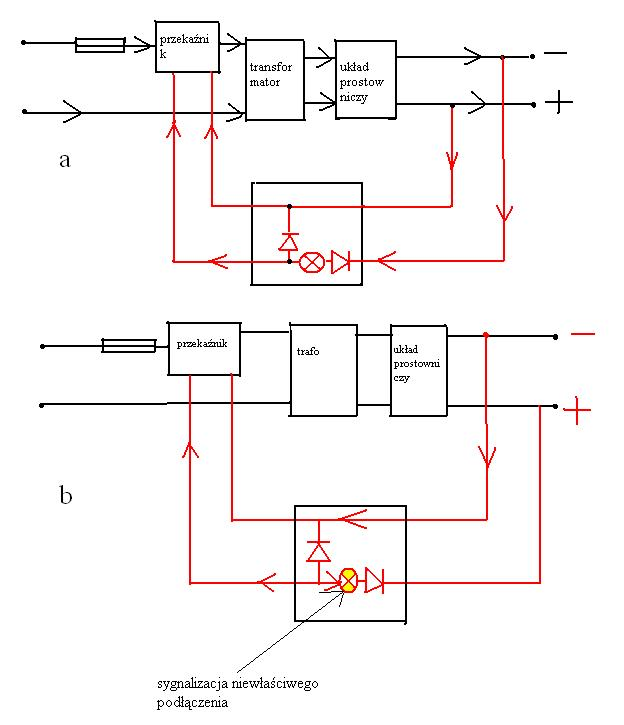 Bład tkwi w założeniach. Jeśli zamienisz kolejność przewodów przy podłączaniu akumulatora do prostownika to akumulator zostaje natychmiast zwarty przez diody w prostowniku. Przy w miarę dobrze naładowanym akumulatorze pewno skończy się to odpaleniem diod, przy słabiej naładowanym wystapi tylko niezły błysk przy podłaczaniu. Tak czy inaczej dodatkowy wskaźnik jest zbedny bo efekty świetlne będą wystarczające. Zamiast tego pomyslałbym o układzie na np przekaźniku który by automatycznie zmieniał biegunowośc przy nieprawidłowym podłączeniu. Można wtedy dać wskaźnik działania takiego układziku, inna sprawa że jest to wtedy tylko gadżet .