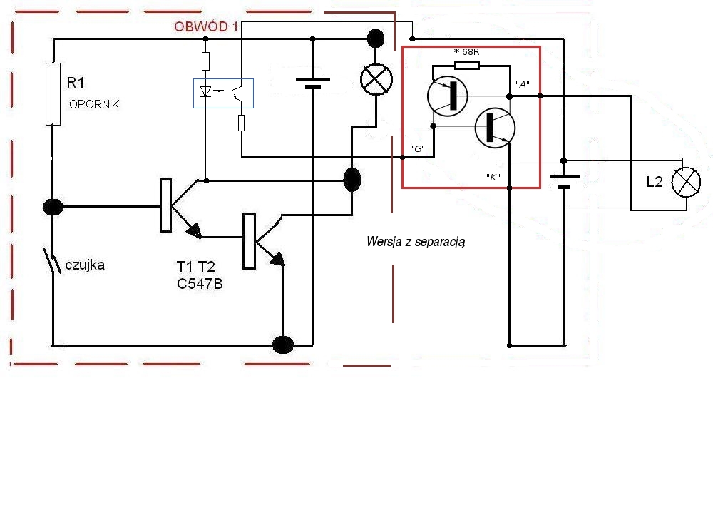 Z ciekawością przyglądałem się waszym osiągnięciom i mam pare uwag co do waszych układów. Do doskonałości jeszcze daleka droga ale najważniejsze to się nie poddawać. Otóż Blantek212 narysował układ powiedzmy "przekaźnikowy" jak sam to nazwał i tu widać że tranzystory przy rozłączeniu się kontaktronu polaryzują (otwierają) się wraz z dwoma dołączonymi tranzystorami i równocześnie zwierają źródło zasilania co jest niebezpieczne dla nich samych. Z drugiej strony gdy te ww wytrzymają udar żarówka L2 będzie świecić naprzemian z L1 i nie uzyska się efektu żekomego "przekaźnika"