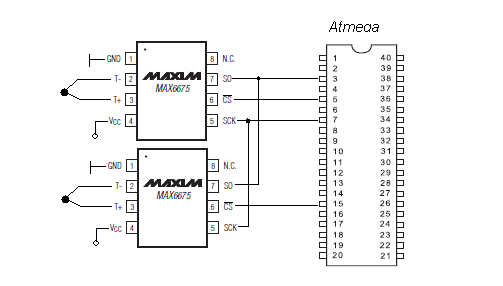 Dwa przetworniki termopar z interfejsami ISP do których podłączyłem termopary.