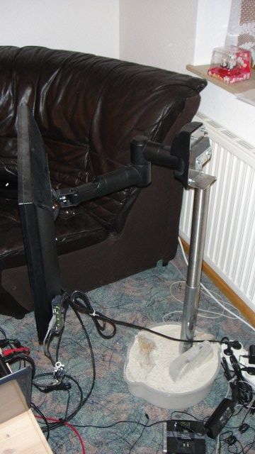 Następnie przykręcamy nasz uchwyt ścienny do L wspornika za pomocą śrub i przystępujemy do wykonania stopy - bazy. Ciężar bazy powinien być dobrany do ciężaru monitora , mój LCD waży ok. 12kg a baza też gdzieś koło tego, osobiście zużyłem pół worka zaprawy i 3 spore kamienie.