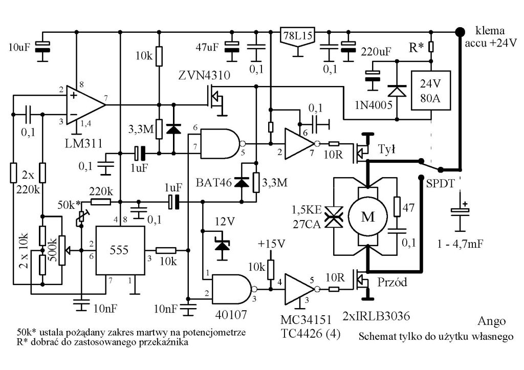 Przedstawiony układ został opracowany do prostego sterowania silnikiem łodzi ale z powodzeniem można go zastosować np. w wózku inwalidzkim czy tp. Ponieważ MOS-y P z dużym Id są drogie, zastąpiłem je przekaźnikiem.