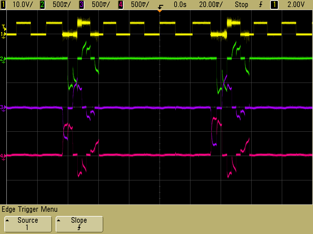 W załączniku zamieściłem obraz z przebiegami na wyjściu: kolor żółty to sygnał halla, pozostałe przebiegi to wartości prądów poszczególnych faz. Program przewiduje pętlę 6-ciu różnych stanów w zależności od sygnałów z 3 hallotronów, które są odbierane przez mikrokontroler na wejścia PCINT. Jak widać na początku przebiegi wydają się być prawidłowe, program realizuje pełną pętlę, oraz dwa kolejne kroki po czym z niewiadomych powodów następuje przerwa ok. 80ms i kolejna inicjacja. Z czego to może wynikać? Czy z jakichś powodów uC może się resetować?