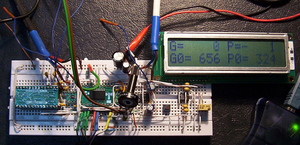 W dolnej linii są wyświetlane wartości spoczynkowe sygnału amplitudy (G0) i fazy (P0), które są pobrane po naciśnięciu przycisku. Liczby w górnym wierszu pokazują na bieżąco zmiany wartości w stosunku do tych z dolnej linii. Wyświetlane są bezpośrednio wyniki z wbudowanego ADC o 10-bitowej rozdzielczości (0..1023).