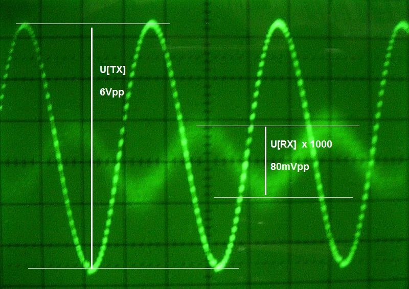 Przy zasilaniu cewki TX przebiegiem 6Vpp na wyjściu przedwzmacniacza (o 1000-krotnym wzmocnieniu) jest obecnie około 80mVpp. To oznacza, że bezpośrednio na zaciskach cewki RX jest około 80µVpp.