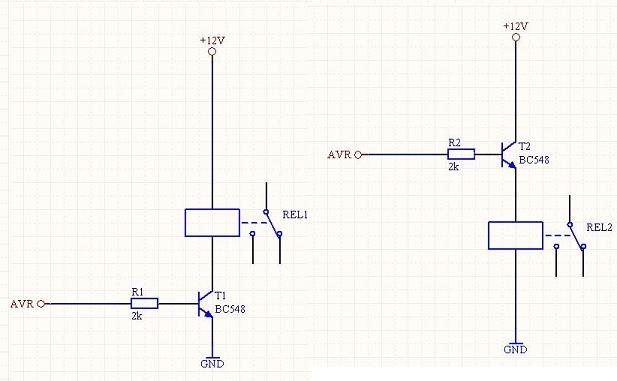 Tranzystor sterowany jest z mikrokontrolera AVR zasilanego 5V. Cewka przekaźnika 12V.