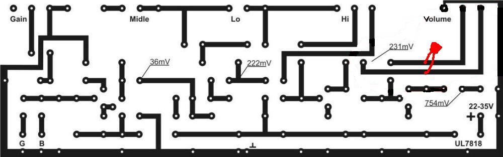 Witam! Kondensator 1nF jest dolutowany od spodu płytki, lub bezpośrednio do potencjometru, czym ciszej grasz tym bardziej są wytłumiane niskie częstotliwości a podbijane wysokie, a jak rozkręcisz na maksa to on w ogóle nie działa, jest to taki prosty filtr RC a od ustawienia potencjometru zależny jego dobroć, więc najlepiej dolutuj go eksperymentalnie na odsłuch. Zależne jest to też od średnicy głośnika i jego zawieszenia, jak to będzie głośnik 15 cali to na pewno się to przyda, a jak będzie to głośnik 8 cali z dobrą górą, to może się okazać że tych sopranów będzie za dużo, dla tego musisz to sprawdzić dolutowując go, to też zależy jakie przetworniki są w gitarze. Gdyby się okazało że układ jest za czuły, to wyrzuć ostatni tranzystor i jego elementy, a sygnał pobierz bezpośrednio z środkowej nóżki potencjometru Volume, albo z ostatniego stopnia zrób wtórnik emiter owy. A najkorzystniej było by wstawienie po między dwa ostatnie stopnie filtru pasywnego z wytłumieniem 50% dla 400Hz, a jeszcze korzystniej było by dołożenie trzech filtrów, jednego pasywnego i dwóch aktywnych.