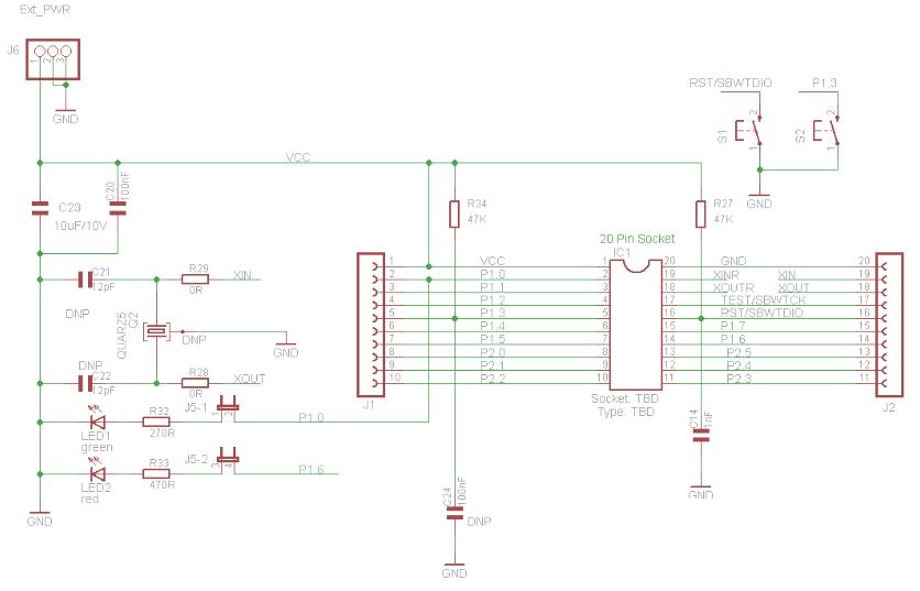 - MSP430G2211 ( 128 B RAM, 2 kB FLASH, 10 I/O, Watchdog, licznik TAR + 2 rej. C/C, Comparator )