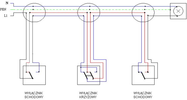 Może ktoś posiada Schemat instalacji oświtlenia klatki schodowej , tzn z dwoma wyłącznikami. Interesowałoby mnie również rozwiązanie połączeń w przypadku wiekszej liczby wyłączników niż 2.