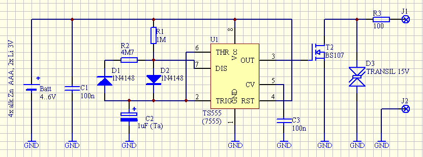- jako U1: TS555 (STMicroelectronics) - czyli jedyna znana mi wersja CMOSowej 555 działajaca z zasilaniem od 2V.