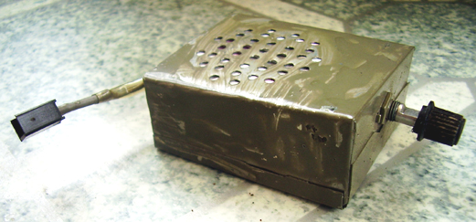 Wielkość obudowy i płytki zależy oczywiście od zastosowanego głośnika. Na jednej ze ścianek pudełka należy zamontować potencjometr z wyłącznikiem. Z drugiej strony należy wyprowadzić 2 krótkie (ok.10cm) przewody do podłączenia układu i zakończyć je wtyczką.
