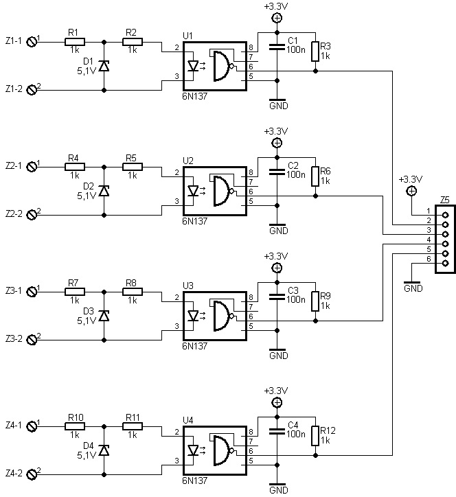 Rezystory R1, R2 oraz dioda Zenera 5,1V ustalają prąd diody LED transoptora. Napięcie podawane na diodę LED transoptora nie może przekroczyć wartości 5,5 V. Transoptor powinien być zasilany napięciem z zakresu 4,5 do 5,5 V. Pracuje on jednak poprawnie już przy napięciu 3,3 V.